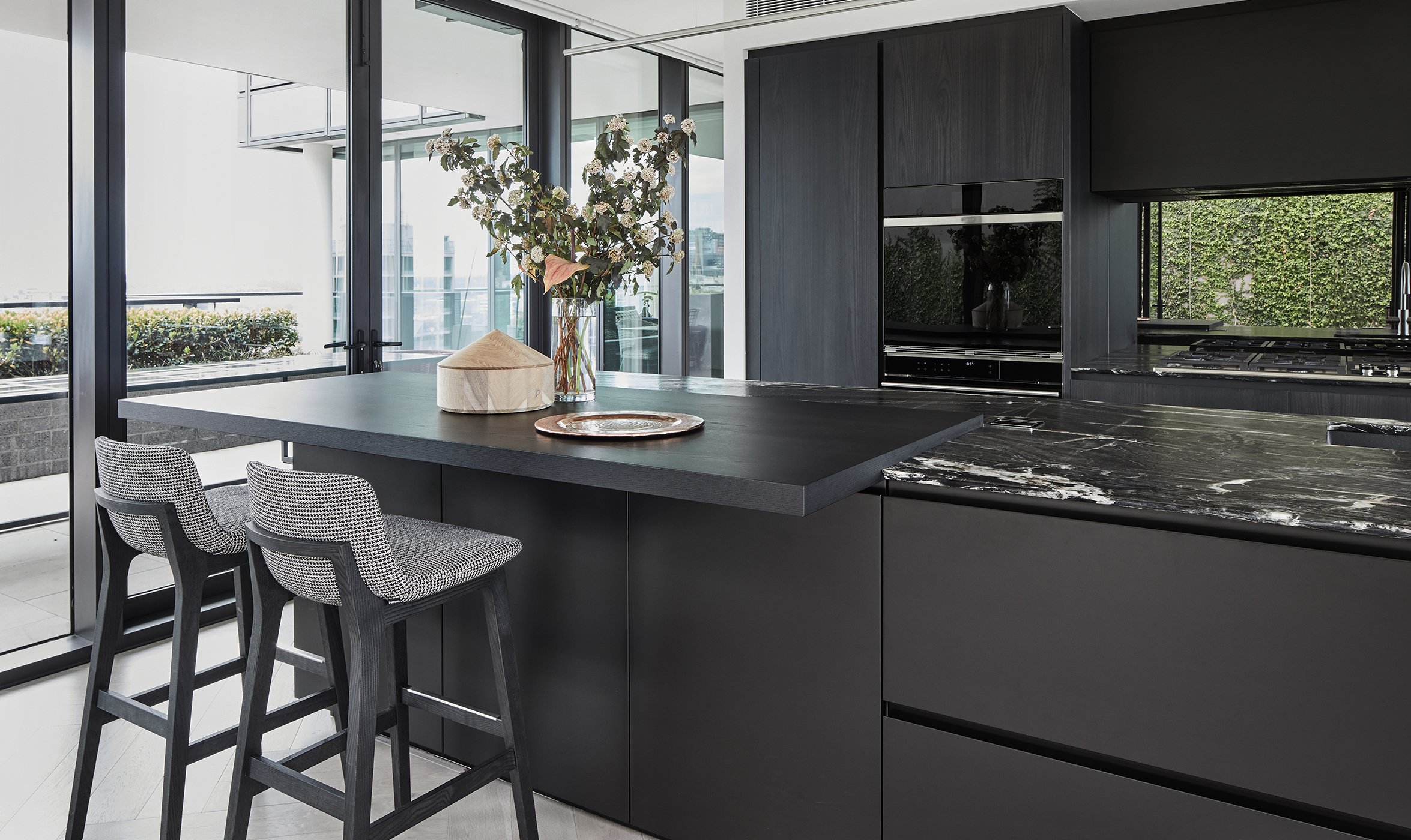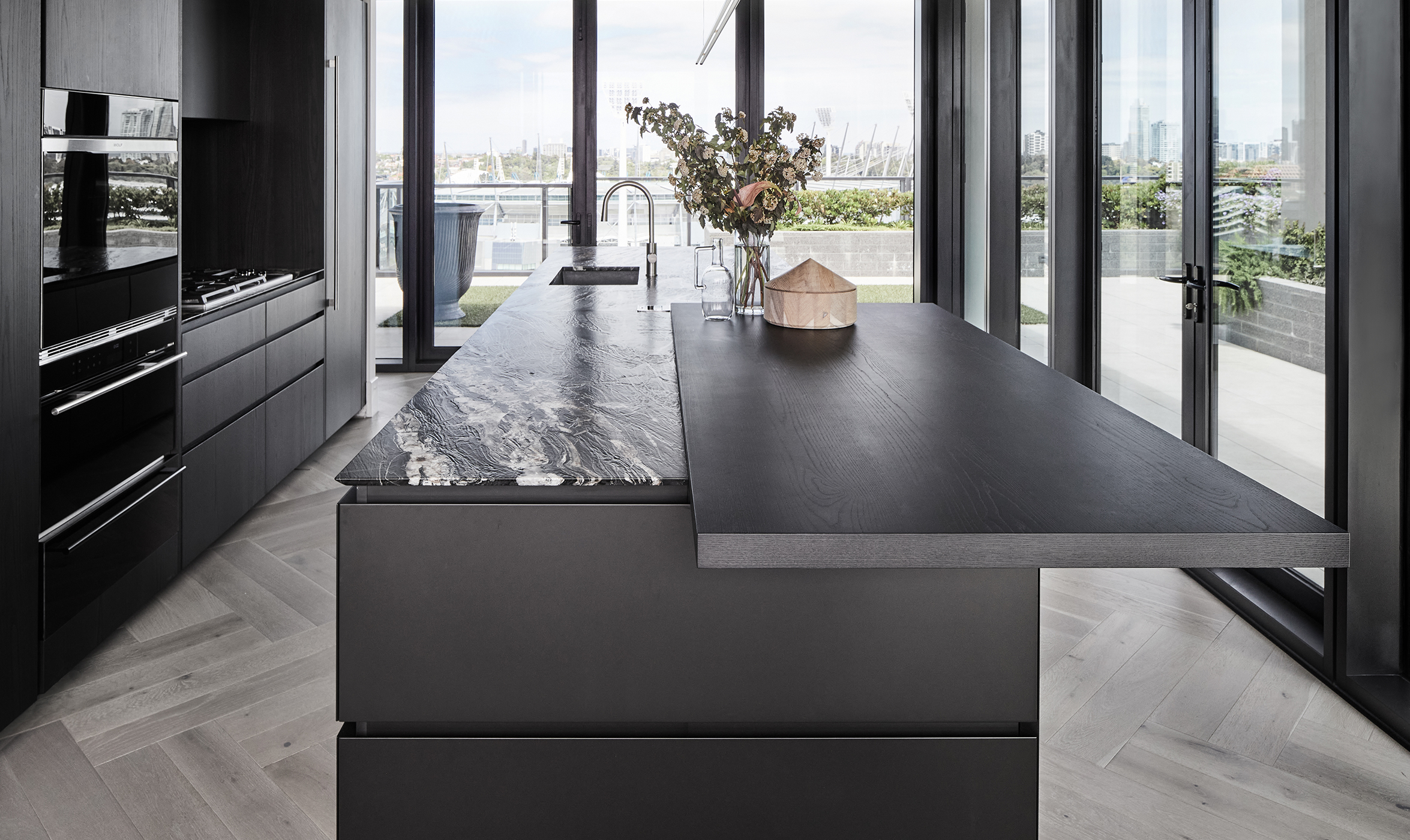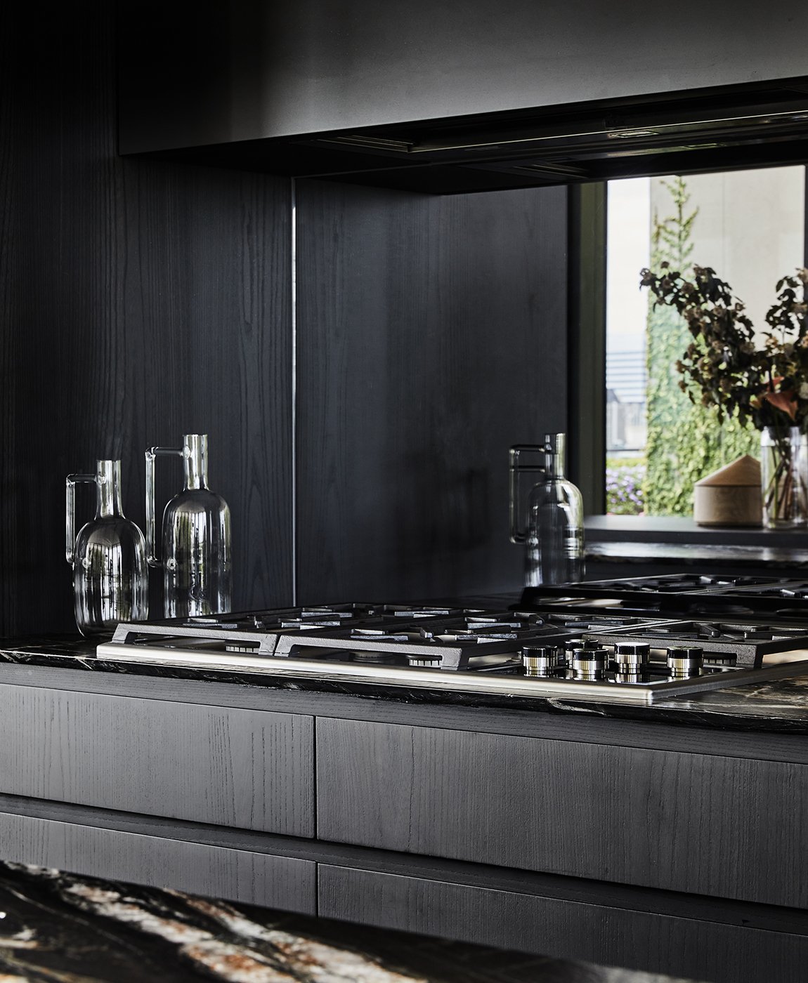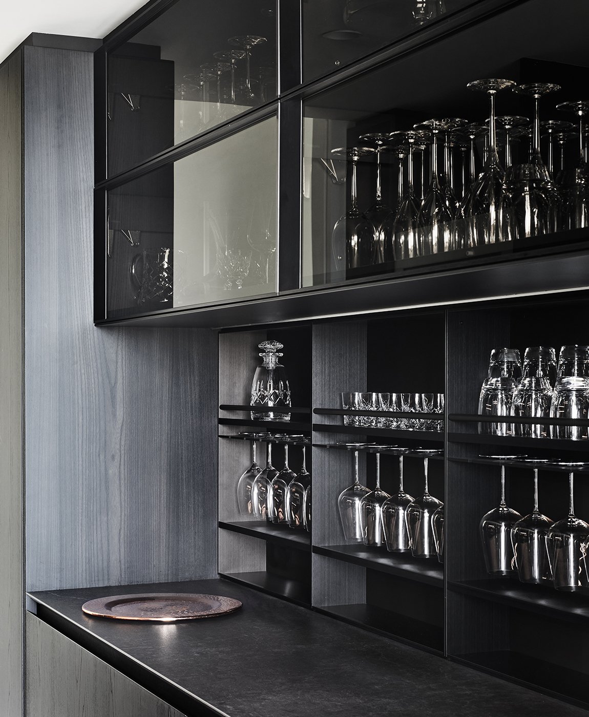 The Kitchen, which is separate from the open plan lounge and dining area, but accessed from two sides, features an impressive island bench, approximately four metres long and 1.5 metres wide. Made from Signorino’s ‘Cosmic Gold’, a blackish grey stone with veins of gold and brown and a leather-like finish, it’s the perfect ‘crown’ to the Poliform joinery used in both the kitchen and the butler’s kitchen that also doubles as storage for wine and wine glasses. Poliform’s deep matt-lacquered embossed Moka doors conceal the ingenious partitions that allow for everything from cutlery storage to presenting individual plates in an upright position for ease of access. “I like to have everything at my fingertips,” says Jenny, who enjoys being able to cook at the stove and see Ian’s reflection in the black-mirrored splashback, working on the stained elm table that’s been layered on top of the island bench. As one would expect from Poliform, the kitchen and the butler’s kitchen include integrated appliances such as a concealed fridge, freezer drawers below the island bench and a one stop Zip tap that delivers boiling through to cold and even sparkling water. Lighting has also been strategically placed such as the slimline Tubino light over the bench for task lighting and concealed LED lighting in cupboards that become activated when cupboard doors are opened. “Quality is something that can’t be substituted,” adds Walton.