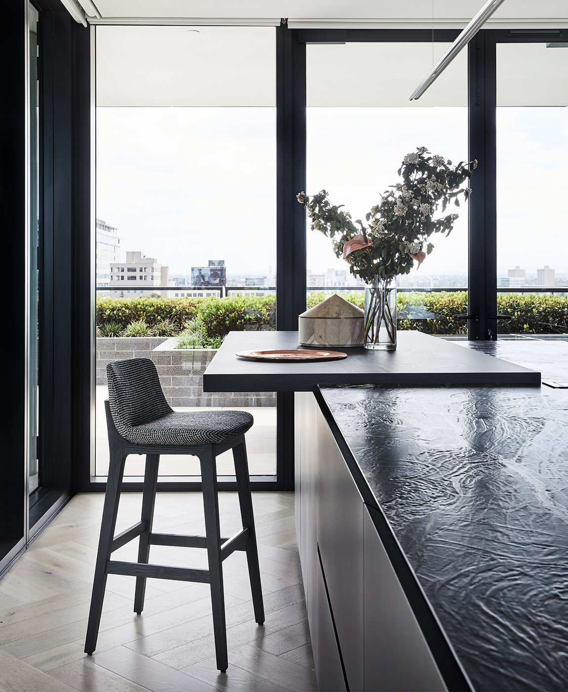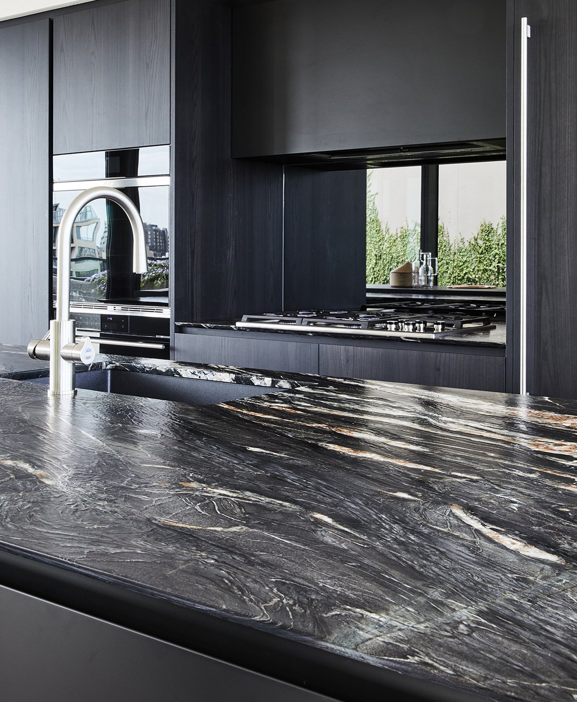 While the size of the apartment and the outdoor garden/terraces are rare, so is the kitchen which has been reworked by interior designer Sally-Anne Walton. Framed by gardens on three sides, with floor-to-ceiling glazing on each, the Poliform Artex kitchen, including a butler’s kitchen, could handle a slightly more moody and tactile touch. “We wanted a kitchen that looked great, but one that was also extremely functional and, you could say ‘not too precious’,” says Jenny, who lives in this impressive apartment with her husband Ian. “I certainly didn’t want surfaces to mark or scratch, given I enjoy entertaining family and friends,” she adds.