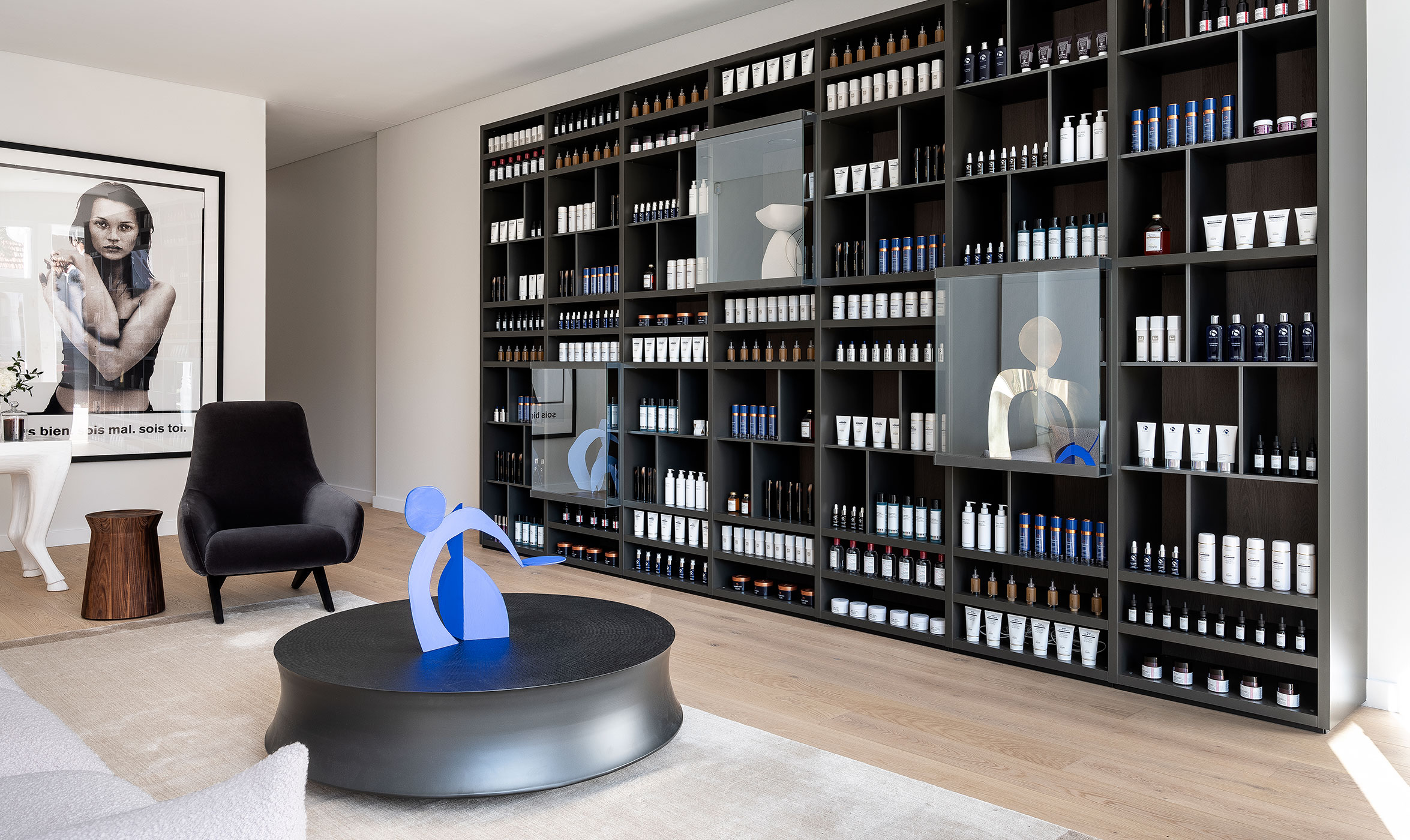 The new studio reception is a welcoming, light filled space, featuring Poliform furniture for clients to relax on and a large Poliform wall system which houses both skin care products for the retail business along with beautiful artworks and sculptures to enhance the space.