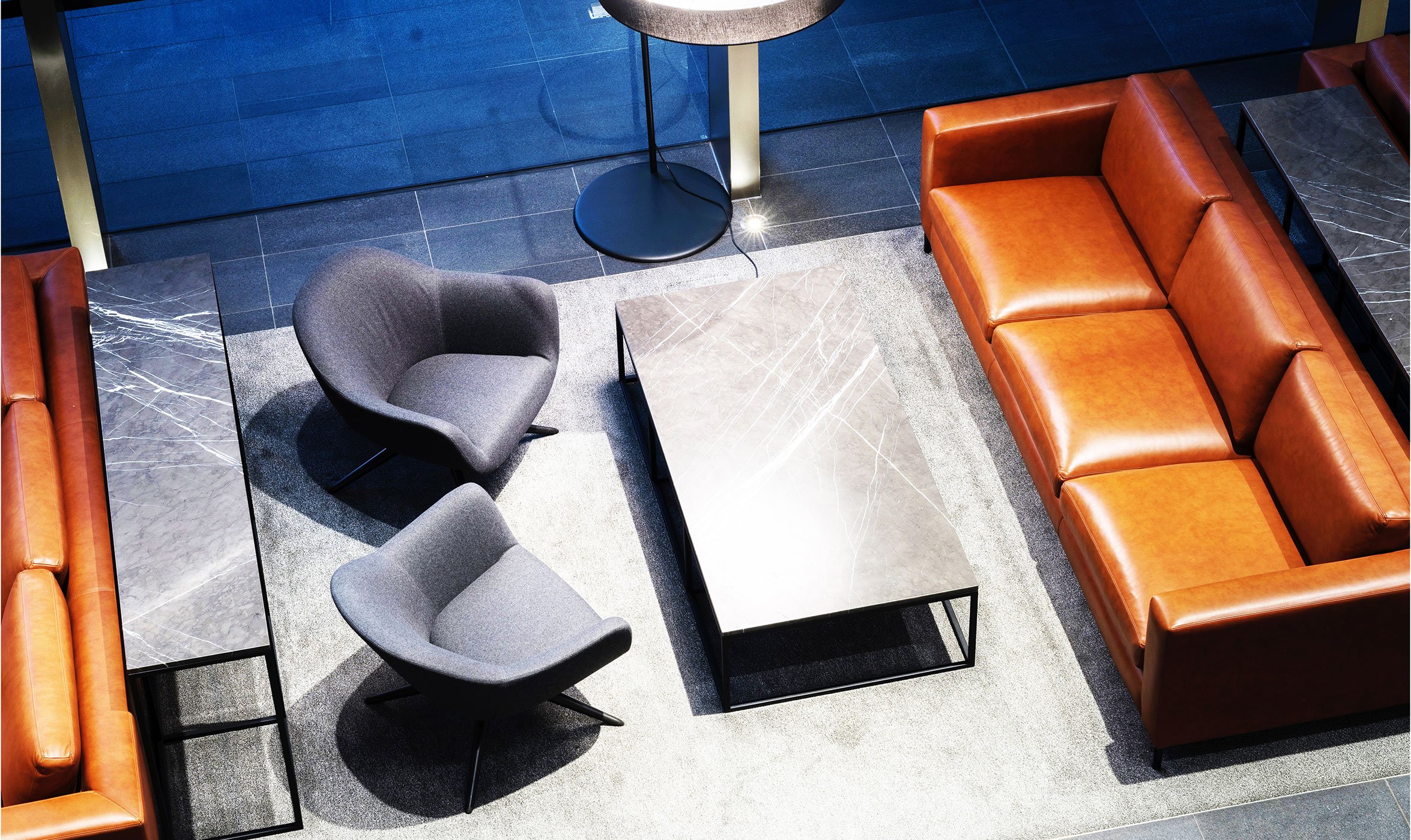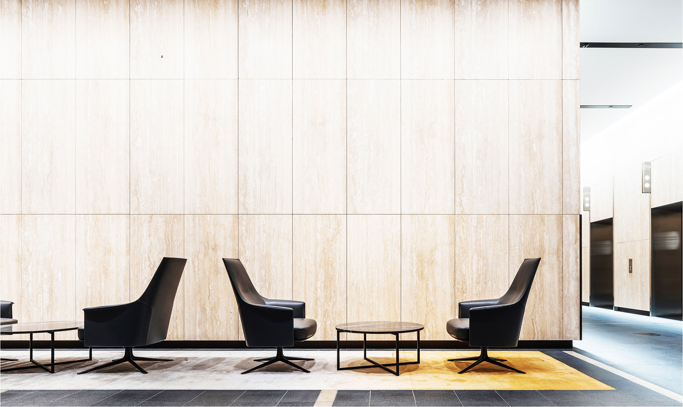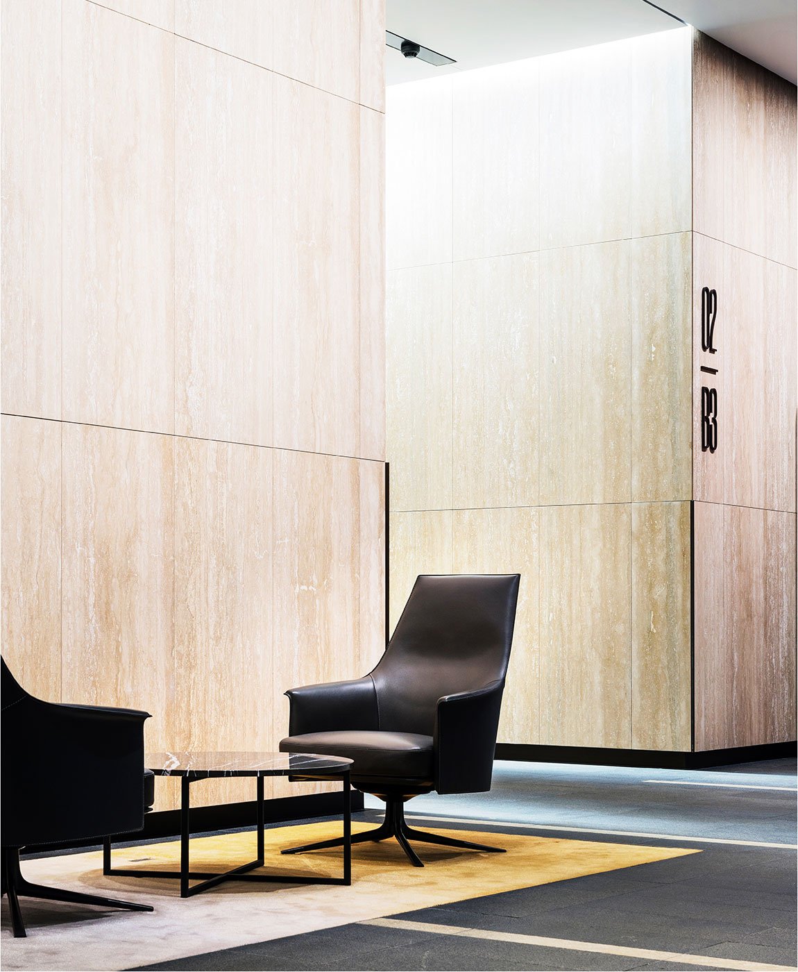 The foyer inside 4 Parramatta Square in the Walker building is a grand space with a contemporary and modernist feel. High revolving doors in a giant glass cube create a space full of reflections, with puce coloured pylons flanking the void. Poliform seating enhances and elevates the interior into something timeless, universal and appealing.