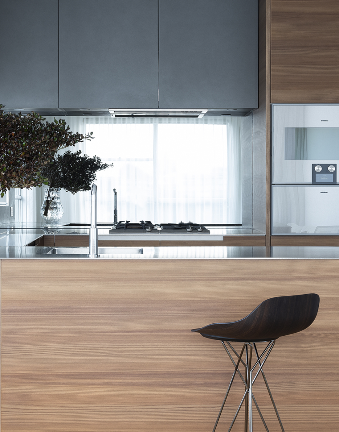 I feel like the design, for those products, are the sort of level I that I like and being a designer myself, I think Italians do design very well. Half the design is in the detail,” Cohen says. The stainless-steel topped Phoenix kitchen – cool and minimal, is warmed up by the mid brown Elm veneer which adds texture and a longitudinal, wood grain. In the kitchen-dining area, cool white tones, and premium grey appliances (all designed by Paul) punctuate the space.