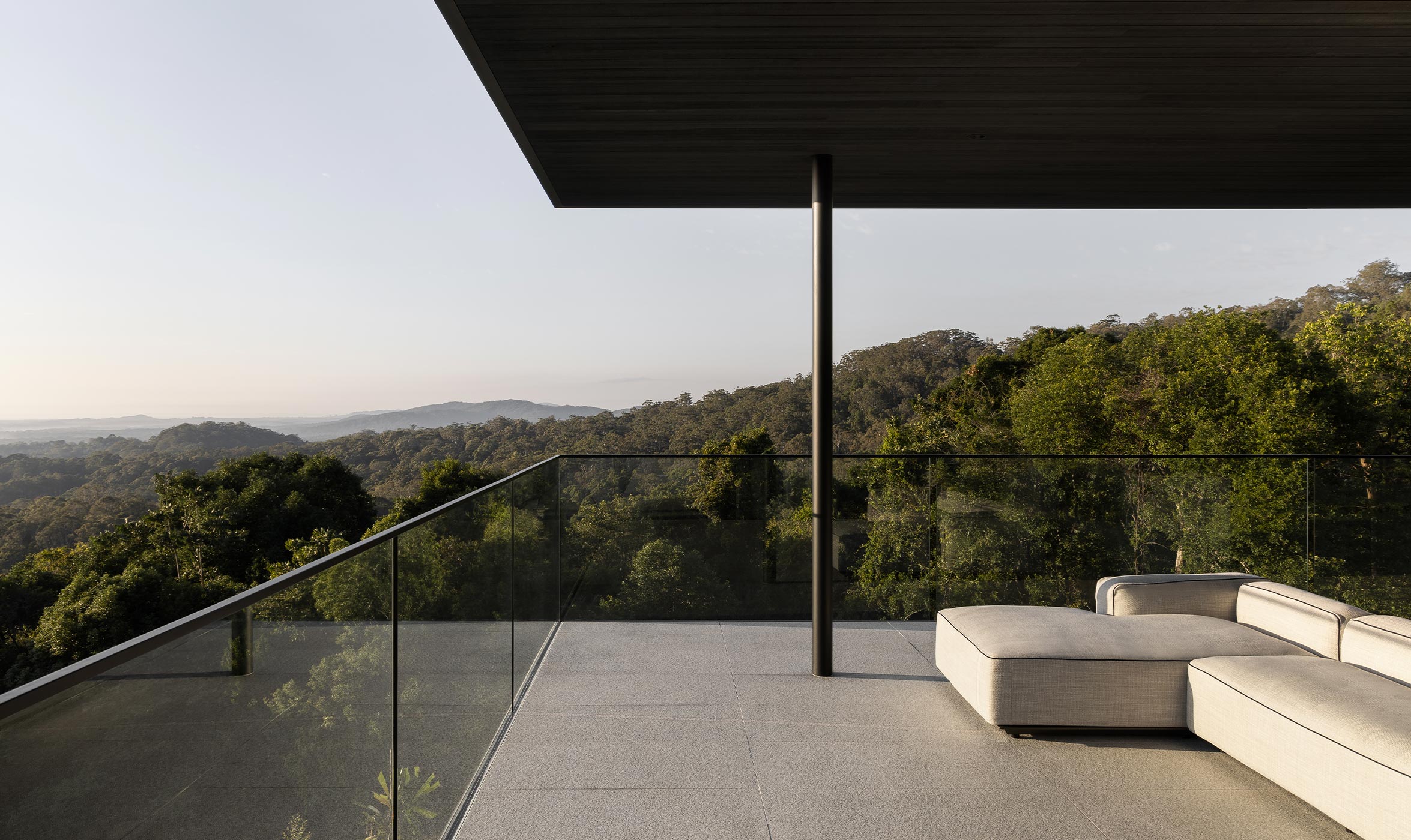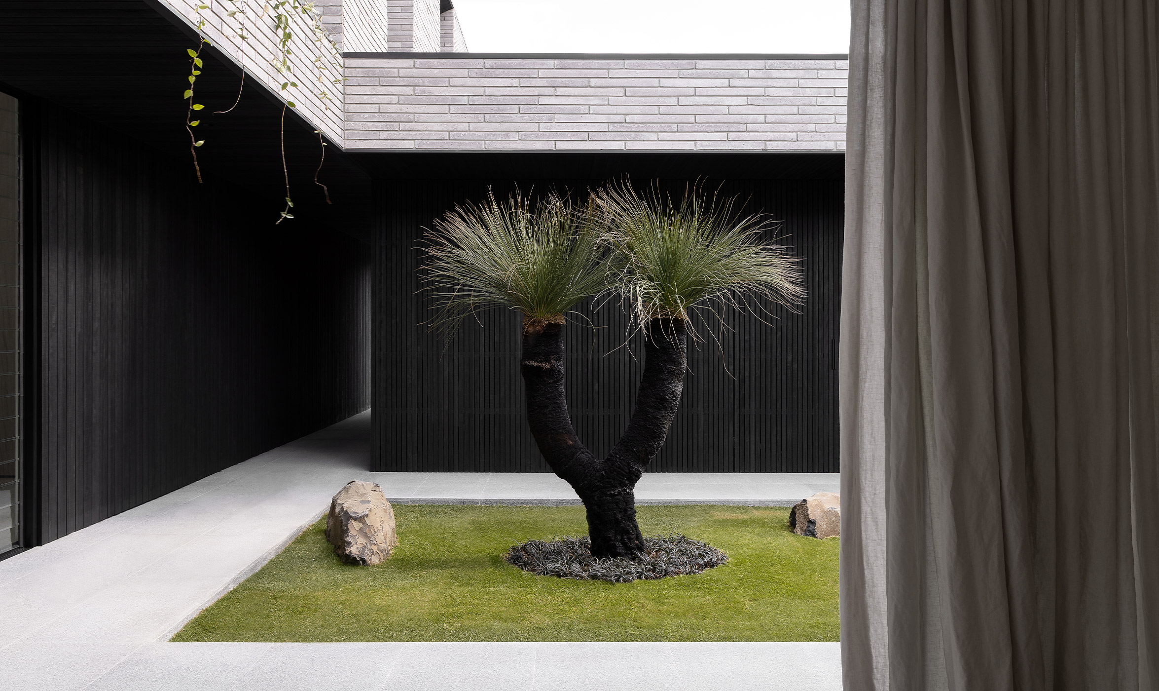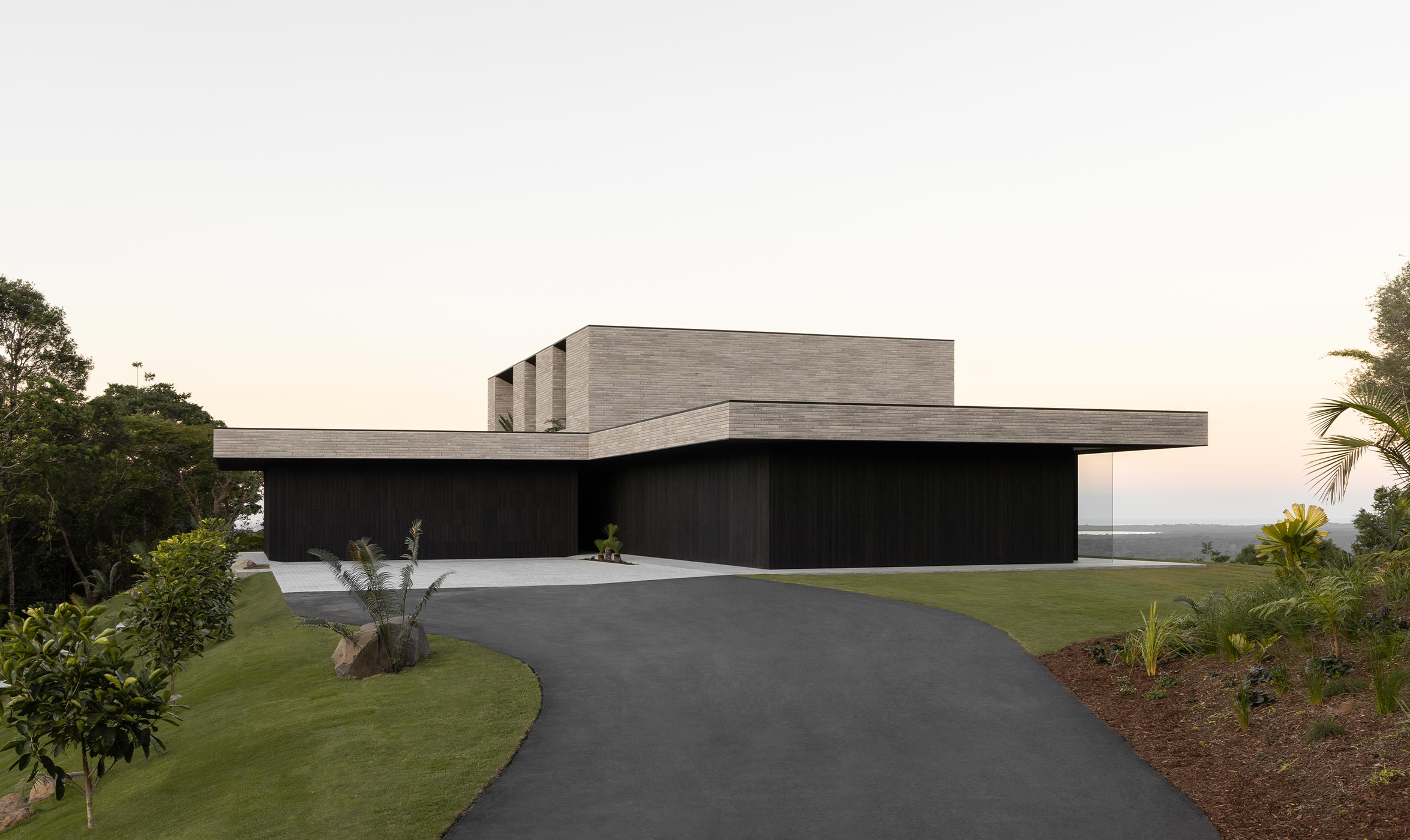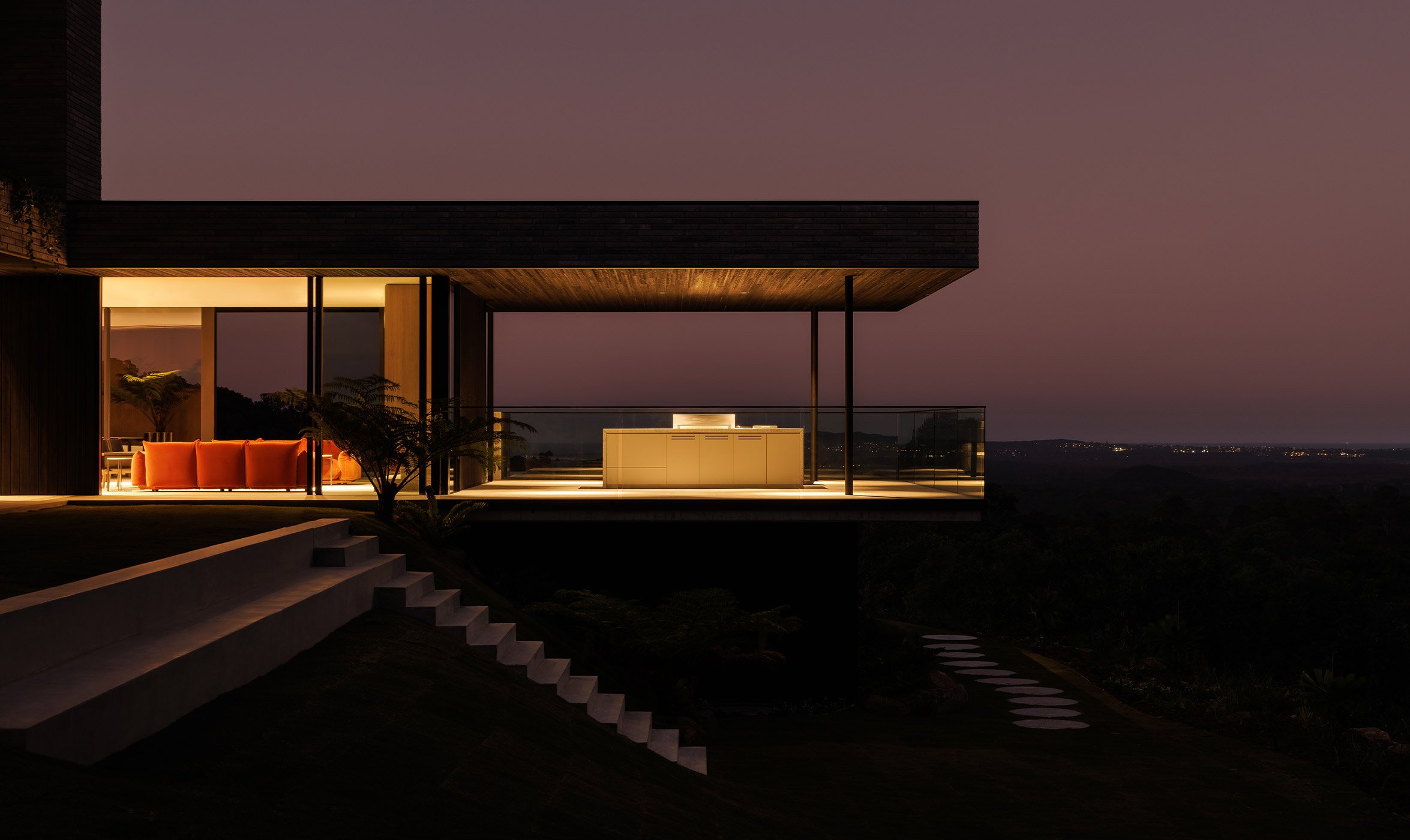 From the outset, Whipbird, named after a native bird to the area, was never going to be the traditional resort home, either in terms of its architecture or the manner in which it was ‘stitched’ together. Zernich’s first conversation with architects, Jen Negline and Andrew Brown from Minnow Studio, focused on not creating something you might find in the Hamptons. Instead, the brief called for the clarity of the mid-century architectural aesthetic and the timeless gems found in the hills of LA (think John Lautner's Sheets-Goldstein Residence). However, rather than off-form concrete, the Whipbird house is clad with black-stained timber from New Zealand that stands up to the Queensland humidity. The recycled bricks further anchor the house to this escarpment.