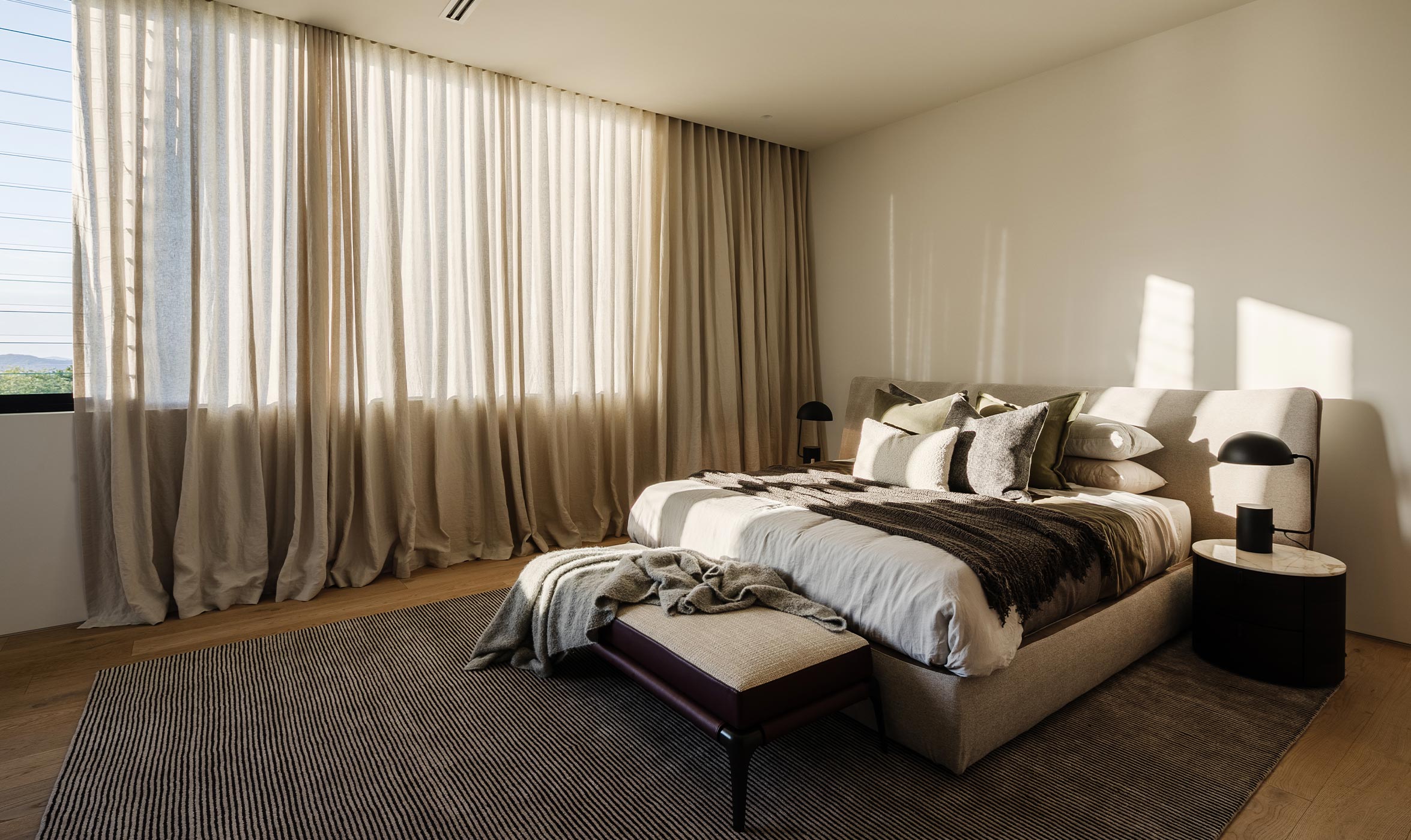 With Whipbird, the main living area, which features floor-to-ceiling glass on three sides, is devoid of paintings, allowing the views to be the main ‘actor,’ so every decision was in response to both the architecture and the feeling Zernich wanted to create throughout the interior. In contrast, in the bedrooms, the earthy tonal colours in the paintings by Natalie Lavelle are offset by the soft hues of leather and wood, as well as the textures and colours in other areas of the house. ‘With each lounge or chair, we were conscious that the sight lines were clear to the views,’ says Hartikainen. ‘Although we didn’t have a clear image of who the eventual buyer of Whipbird would be, it will certainly be an architecture and design aficionado, someone like Jayden who has a strong and clear vision of what they are looking for, and who is not prepared to compromise,’ adds Hartikainen.